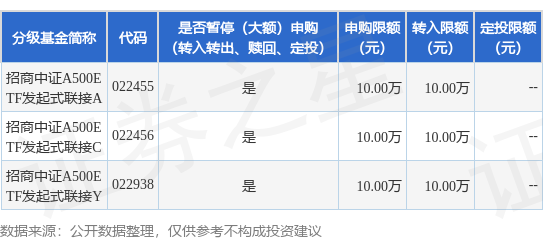 本站消息,9月5日招商基金管理有限公司发布《关于暂停招商中证A500交易型开放式指数证券投资基金发起式联接基金大额申购(含定期定额投资)和转换转入业务的公告》。公告中提示,为保障基金的平稳运作,维护基金份额持有人利益,自2025年9月5日起暂停招商中证A500交易型开放式指数证券投资基金发起式联接基金大额申购(含定期定额投资)和转换转入业务,申购、转换转入上限金额为10.0万元,下属分级基金调整明细如下: