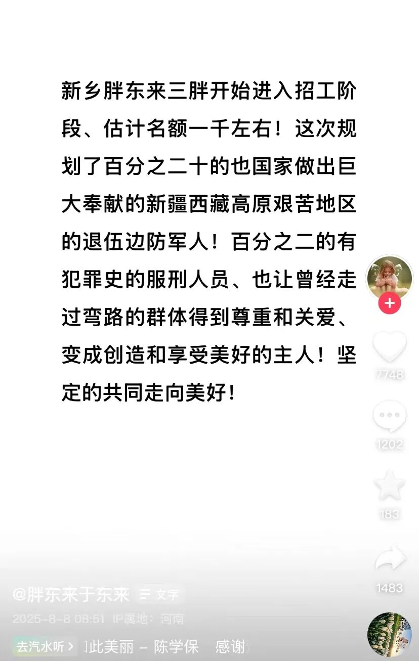 8月8日,胖东来创始人于东来在社交平台发布消息,新乡胖东来三胖开始进入招工阶段,此次预计招工名额在1000个左右。